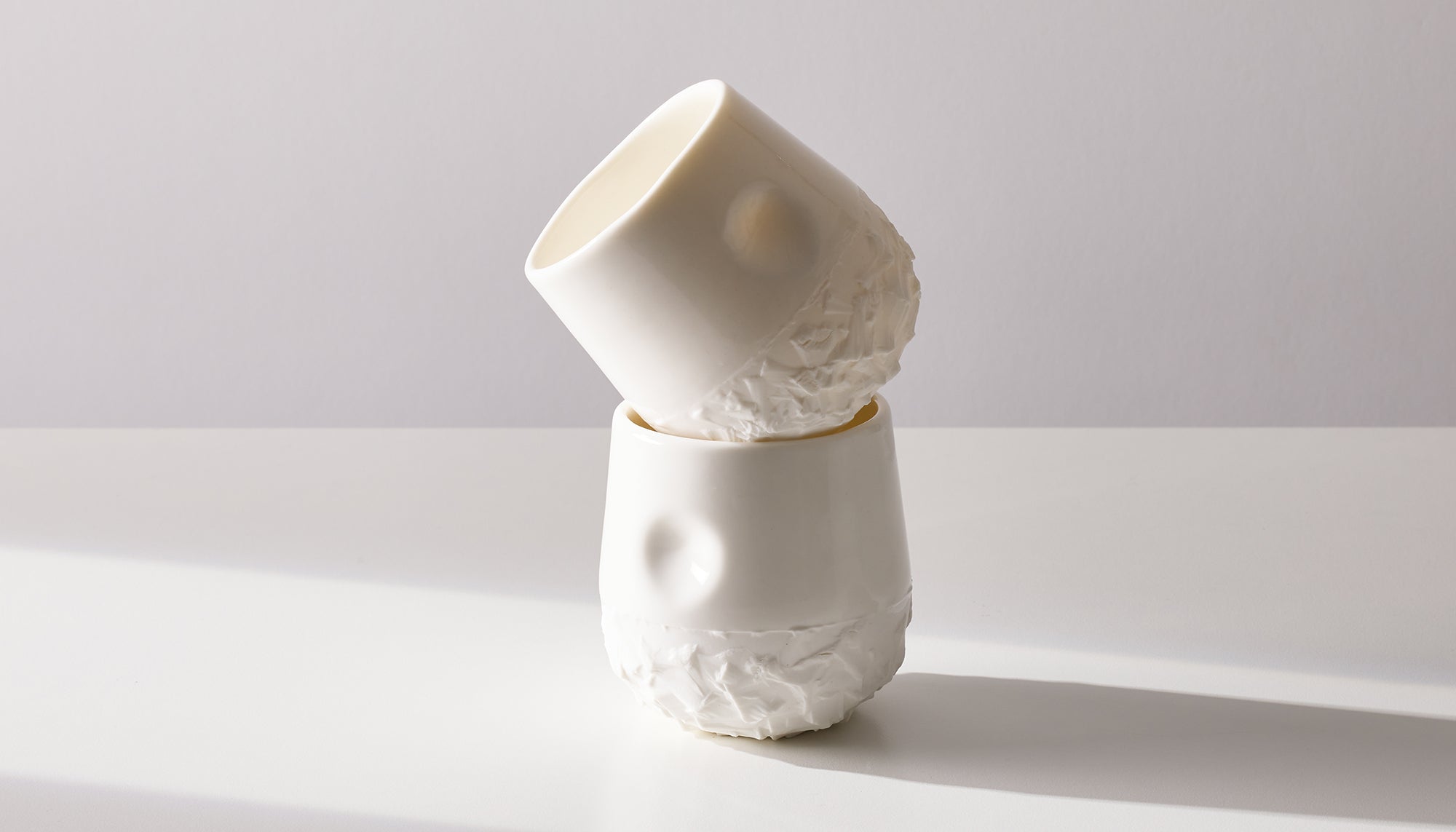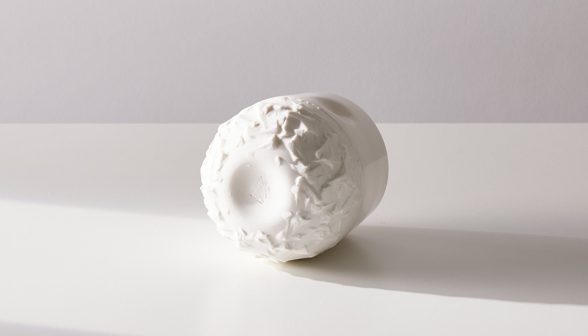 Crafted from rescued and resurrected plaster moulds from the signature Kumo Cup moulds, inspired by waste in commercial ceramic production. Tactility at the forefront with a chiselled rugged exterior and clear gloss interior.